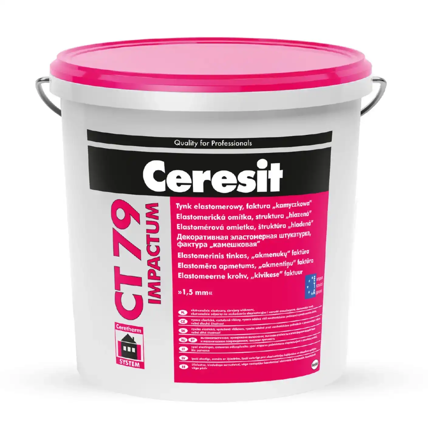 Декоративная штукатурка CT 79 рекомендована для применения в качестве декоративно-защитного слоя в составе ударопрочных фасадных теплоизоляционных композиционных систем (СФТК) «Ceresit Ceretherm Impactum» с теплоизоляционным слоем из пенополистирольных и минераловатных плит, преимущественно на ограждающих конструкциях, где требуется высокая стойкость к механическим повреждениям и загрязнению: цоколях, въездах в гаражи, зонах парковок, зонах, соседствующих с игровыми или спортивными площадками, и т.п.