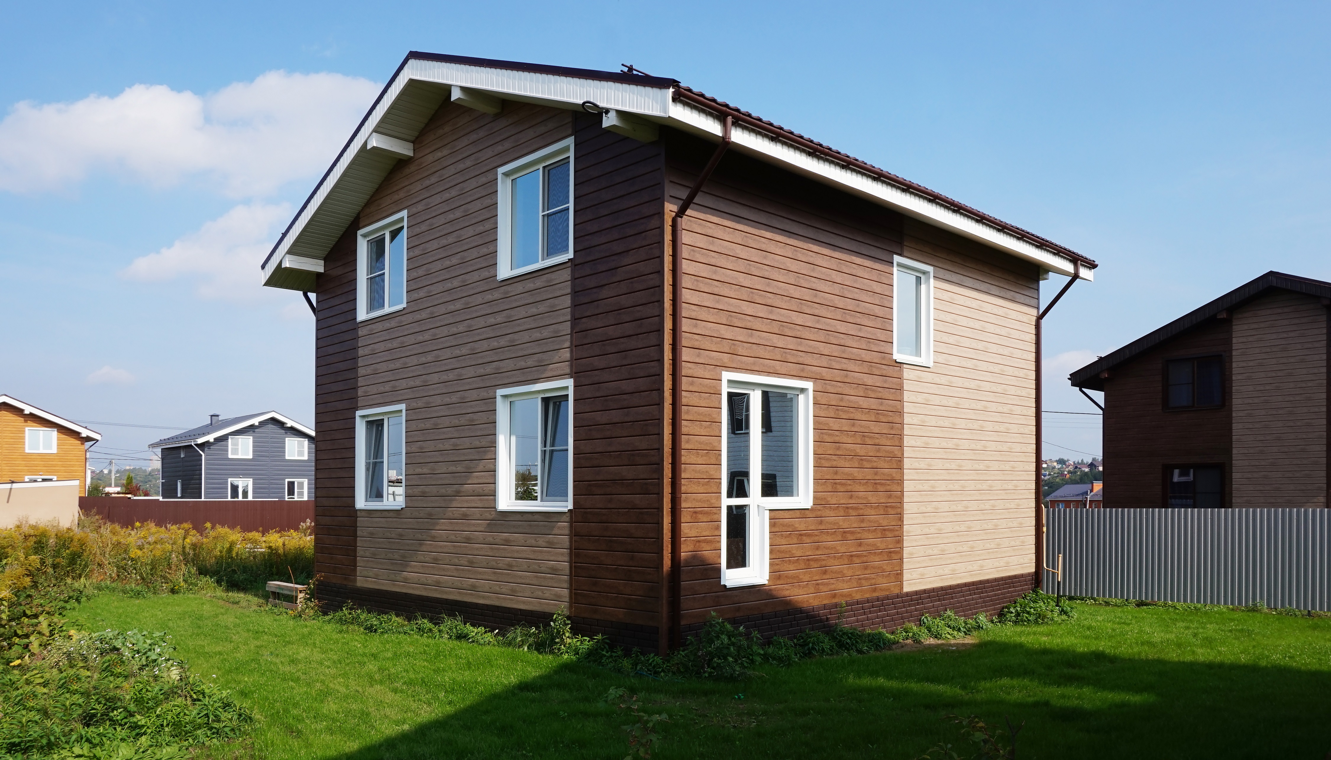 При использовании покрытия Colority® Print, «ЭкоБрус GL» достигает максимального сходства с клееным брусом. Надежное скрытое сцепление панелей придает фасаду здания естественный вид.